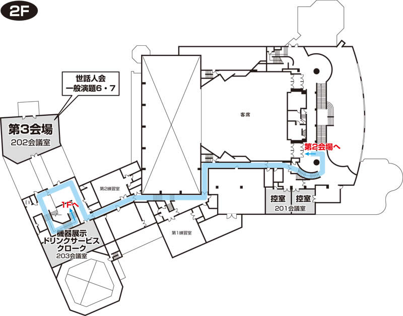 ■ 1Fマップ※第1会場側から第2会場(ホール)へのご移動は、上図の2ルートをご参照くだ さい。一旦外に出ていただくことになりますが、上のピンクのコースが分かりやすくおすすめです。